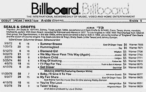 7. Why a Seals & Crofts Website? I became a big fan the moment I heard "Hummingbird" on the radio in early 1973. To my surprise, no one else has created a website, and so I created the first version in 1998. My simple purpose was to post information to their legions of fans and introduce their music to a younger generation. If you have additional info or corrections for this website, please email me at sftony@earthlink.net.
